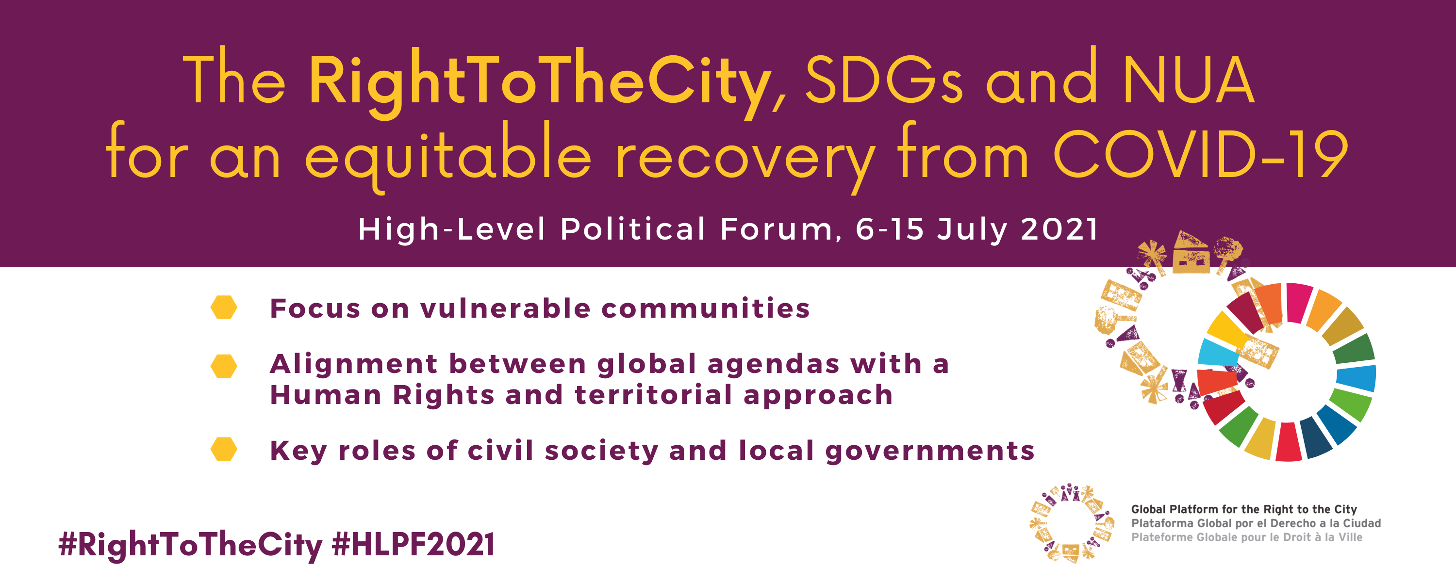 The GPR2C at the High-Level Political Forum 2021 Posted in: Campaigns - The GPR2C will participate in the 2021 High-Level Political Forum on sustainable development (6-15th July) to bring an urgent appeal to the United Nations and all international, regional, national and local institutions and civil society organizations to renew their commitments to the implementation of the Right to the City, SDGs and NUA for an equitable… +