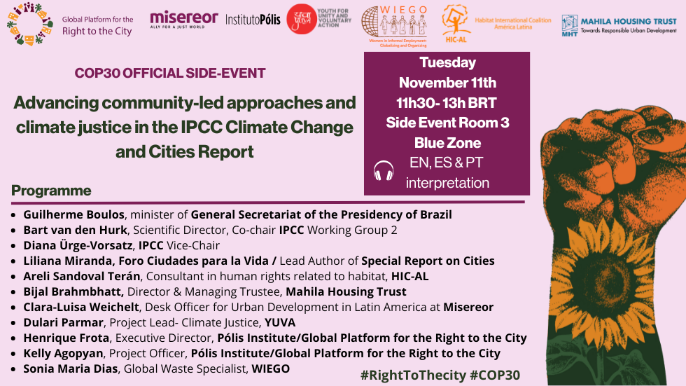 This panel aims to explore the complex impacts of climate change in urban areas, from environmental and spatial challenges to social and economic consequences. It brings together voices from civil society, local governments, academia, worker movements, and international organizations to connect scientific evidence with on-the-ground experience. Framed around key themes from the upcoming IPCC Special Report on Cities and Climate Change –including adaptation, mitigation, loss and damage, climate justice, intersectionality and climate-induced displacement– the event will underscore concrete examples of climate change mitigation and adaptation, with a particular emphasis on community-led initiatives and data production, often under-represented in such discussions.