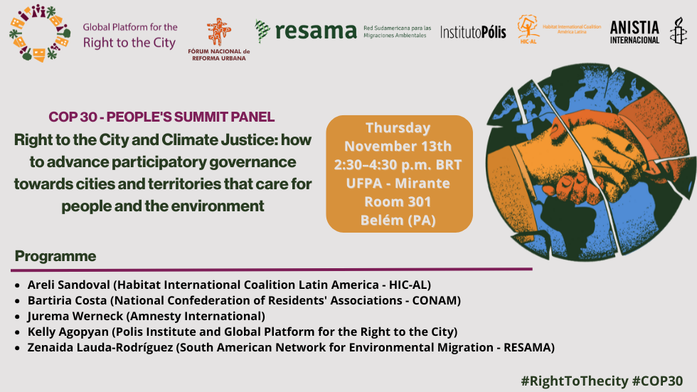 - Organization: Global Platform for the Right to the City, Instituto Pólis , National Forum for Urban Reform (Brazil), Amnesty International and the South American Network for Environmental Migration (RESAMA)