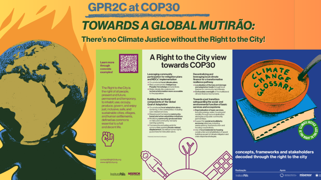 The platform’s efforts towards the conference culminated in the campaign “Towards a Global Mutiny: No Climate Justice without the Right to the City!”. This special page detailed the GPR2C’s campaign at COP30 and served as an access point for key documents. Among the materials highlighted, which seek to facilitate mobilization and advocacy, are the flyer with our full position and the Glossary on Climate Change, which decodes concepts and frameworks for approaching the Right to the City within the scope of Climate Justice. The campaign site has also made available the Latin American Declaration for Climate Justice and the Right to the City, a joint regional position paper drawn up with partners such as HIC-AL, Misereor and IIED-AL.