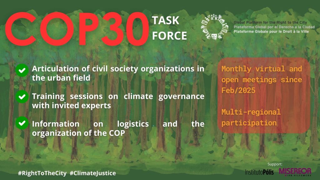 - Roadmaps: to influence the debates on the development of roadmaps – both on the transition from fossil fuels and on forests – which will be led by the Brazilian COP Presidency until COP31, from the perspective of the Right to the City and Climate Justice.